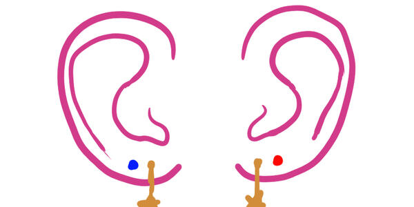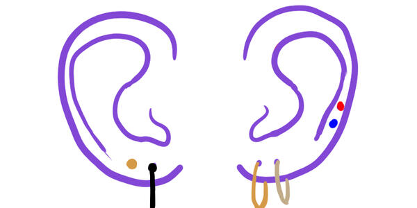 2 lobe piercings on both ears; usually matching earrings